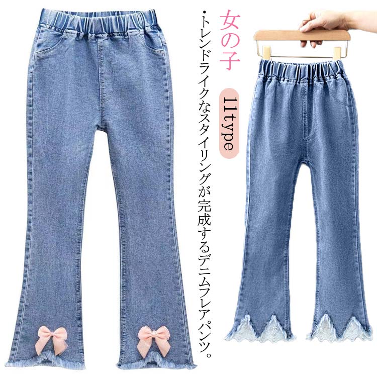 女の子 デニムパンツ ウェストゴム バックポケット 女児 ストレッチ 秋 フレアパンツ キッズ 子供服 裾..
