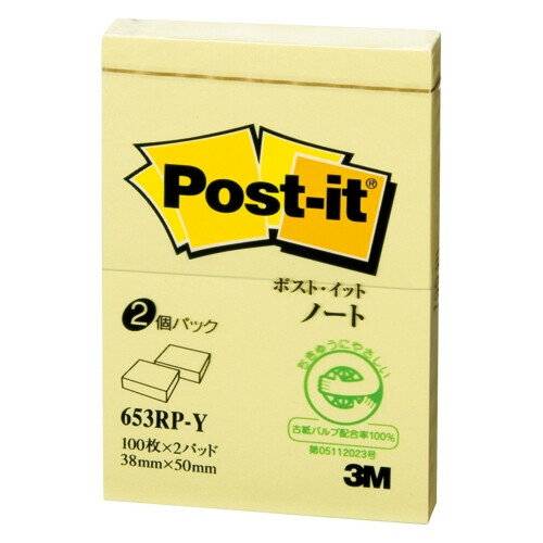 スリーエム ポストイット ふせん 付箋 再生紙ノート 38×50mm 100枚×2 イエロー 653RP-Y - 送料無料※800..