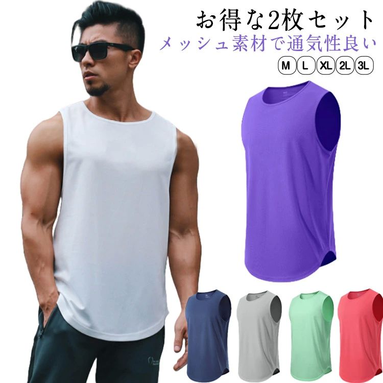 ジム タンクトップ メンズ サッカー 2枚セット ノースリーブ 2枚セット スポーツウェア無地 トレーニン..
